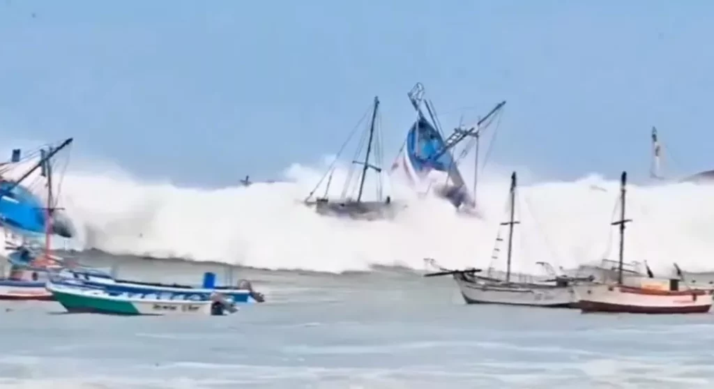 Imagens divulgadas em redes sociais e na mídia local mostraram o rastro de destruição deixado pelas ondas no Peru, com prejuízos significativos tanto para a pesca quanto para o comércio próximo às praias.