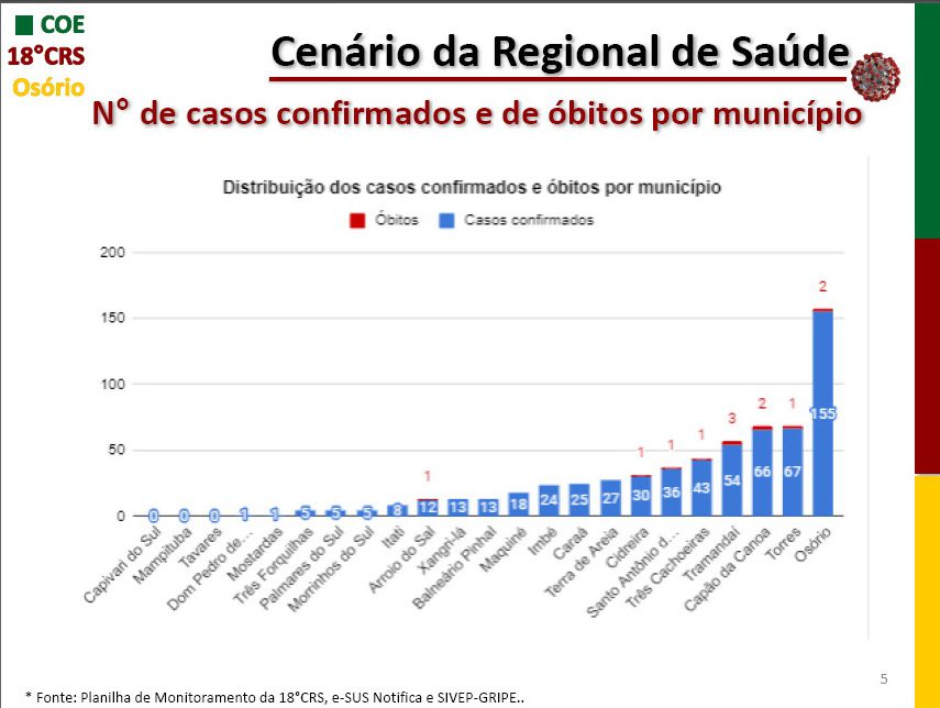 Osório tem 155 casos confirmados, Torres (67), Capão da Canoa (66), Tramandaí (54), Três Cachoeiras (43), Santo Antônio da Patrulha (36) e Cidreira (30).