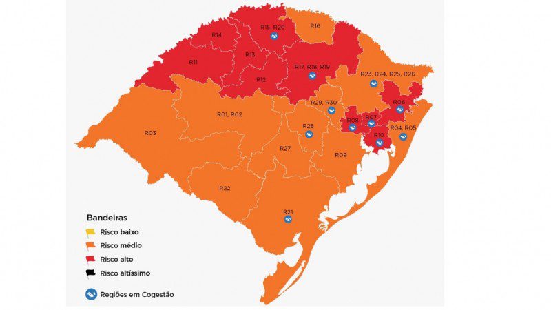 Há seis semanas, cerca de 10,2 milhões de habitantes – 91% da população –, estavam com bandeira preliminar vermelha, o que indica redução importante em áreas sob risco alto de contágio. O Rio Grande do Sul voltou ao patamar registrado há oito semanas, em 3 de julho, quando metade das então 20 regiões Covid foram classificadas previamente em alto risco.