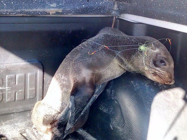 Um lobo-marinho foi encontrado ferido na beira da praia de Imbé, enrolado em um carretel de anzóis, na manhã deste domingo (4).