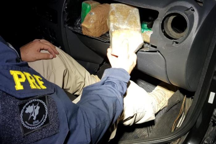 O casal trafegava em um veículo Sandero, com placas de Pelotas, no sentido para Porto Alegre e transportava 16 quilos da droga.