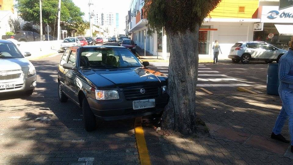 Um mulher que conduzia um Fiat Uno com placas de Novo Hamburgo perdeu o controle do veículo por volta das 11h40min desta quinta-feira (27) e colidiu em uma árvore, no centro do município.