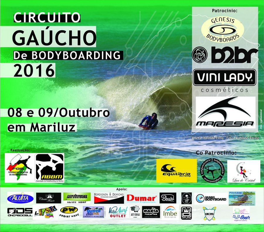circuito-gaucho-2016O Circuito Gaúcho de Bodyboard 2016 terá sua primeira etapa nos dias 8 e 9 de outubro, na praia de Mariluz. O evento será uma realização em conjunto da Federação Gaúcha de Bodyboarding (FGB) e da Associação de Bodyboarding de Mariluz (ABBM), e conta com apoio da Prefeitura. As inscrições ainda estão abertas.