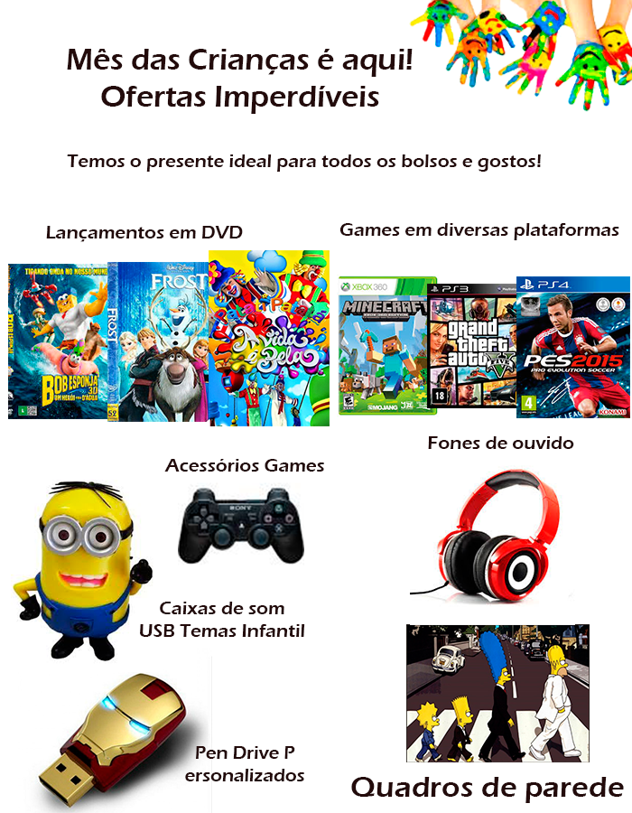 Outubro é o mês das crianças e o presente certo para a criançada está na Disco Mania.Games, CDS, carros em miniatura, pen drives personalizados, minions com entrada USB para ouvir música, almofadas com desenhos infantis, relógios de banda formato vinil e muito, mais muito mais em um só lugar. E o melhor, com preços imperdíveis.Então não esqueça, a Disco Mania fica na Rua Major João Marques, 374, sala 02, em Osório. Telefone: 3663 9092 – 9589 9950. E-mail: discomaniamusic@yahoo.com.br.