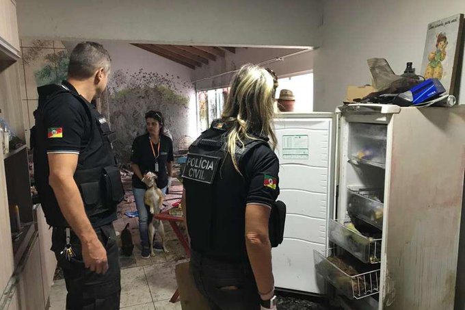 Em um freezer vertical, os policiais acharam cinco cachorros congelados.