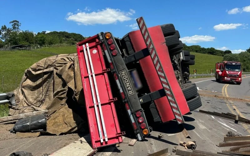 O caminhão acabou tombando em um trevo da rodovia, não envolvendo outros veículos.