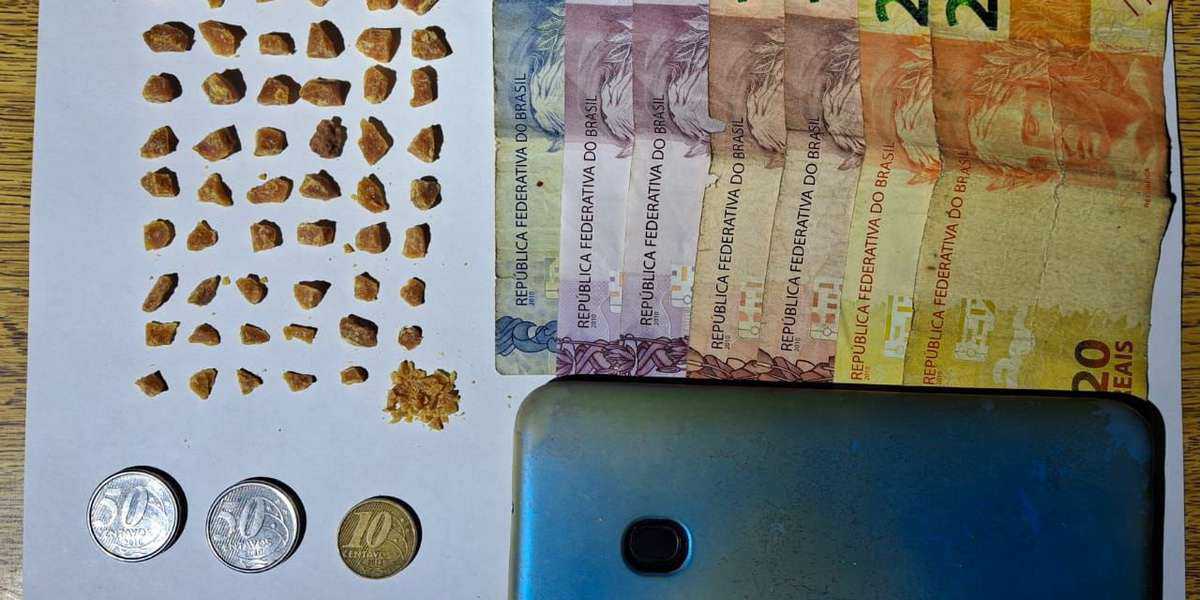 Na ação, a BM apreendeu 26 buchas de cocaína (25g), uma pedra de cocaína (5g), R$ 132,00, um celular e uma cartela de medicamento controlado.