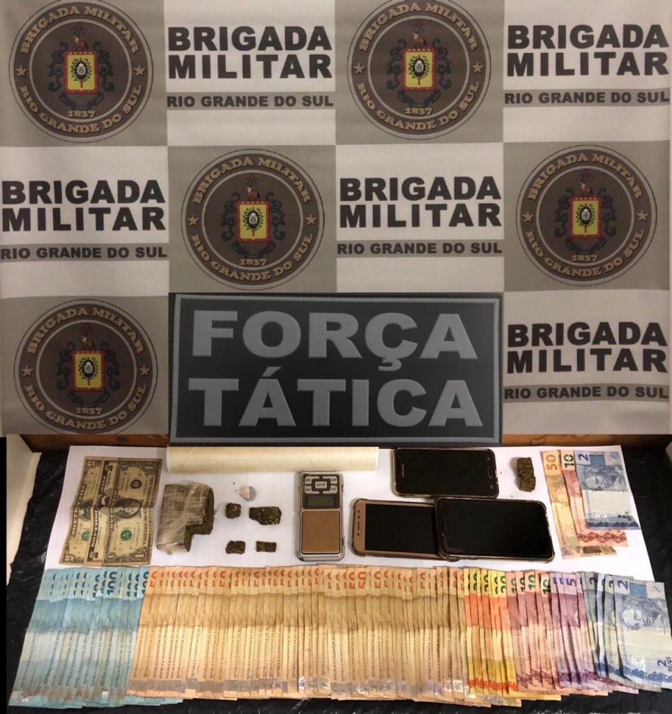 Na ação foram apreendidos: tijolos de maconha, balança de precisão, R$ 4320, U$ 11 e celulares.