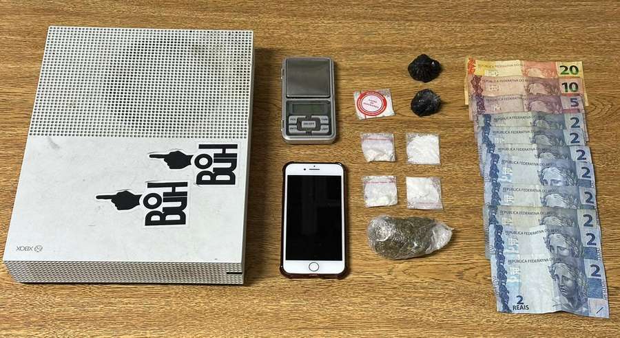 Foram apreendidas seis porções de cocaína, 20 gramas de maconha, uma balança de precisão, R$ 51, um celular e um videogame.