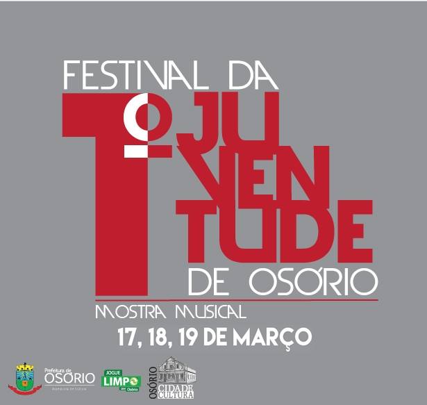 Seguem abertas até a quarta-feira, 02 de março as inscrições para o Primeiro Festival da Juventude de Osório. As mesmas são gratuitas e devem ser feitas pelo e-mail: festivaldajuventudeosorio@hotmail.com. Junto com a ficha de inscrição, deve ser enviado arquivo com o áudio da música em MP3 ou link do vídeo no you tube. Letra breve release da banda e foto com boa resolução.