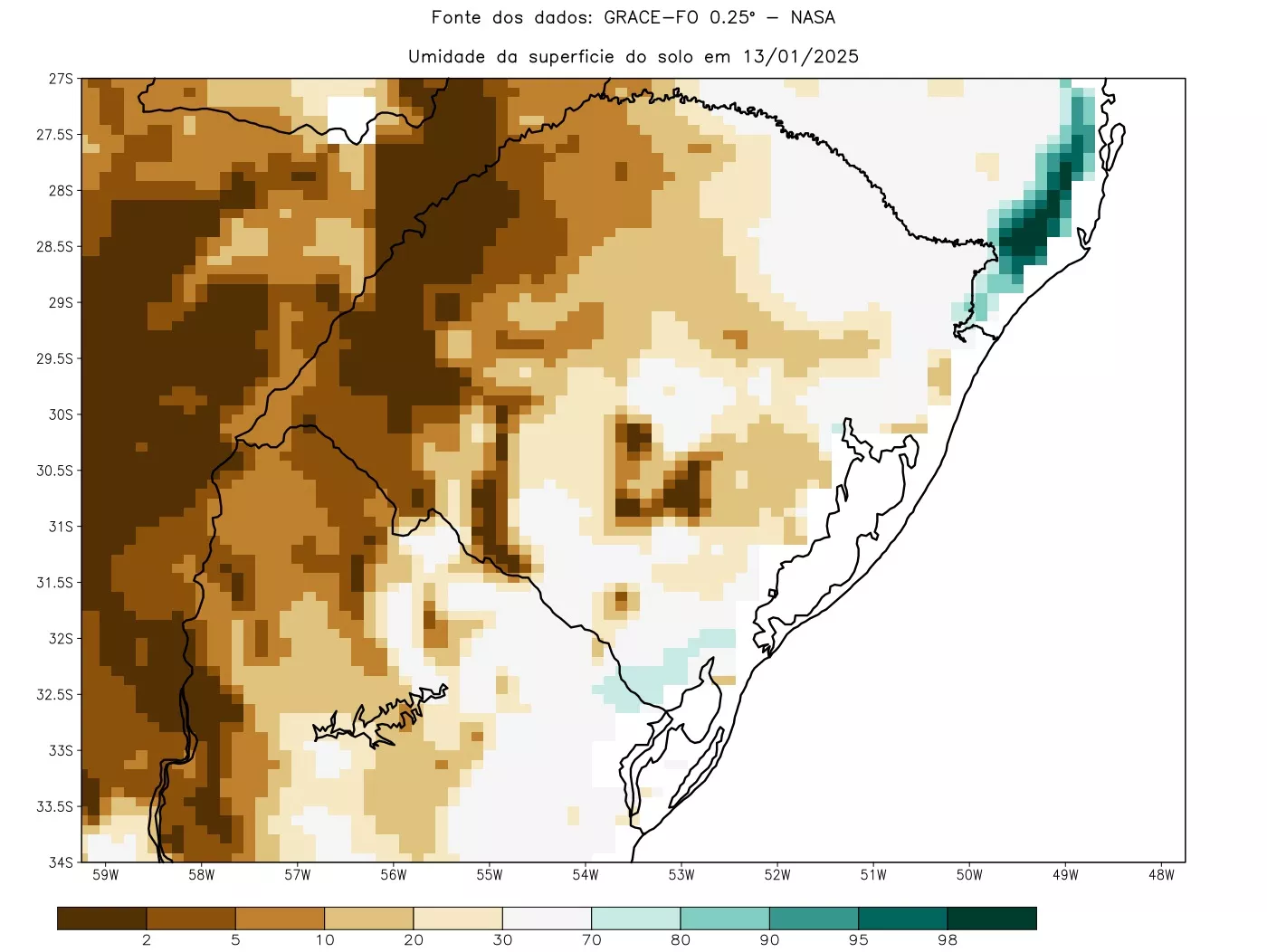 Dados do sistema GRACE da NASA apontam uma queda acentuada na umidade do solo, especialmente no Oeste e Noroeste do estado.