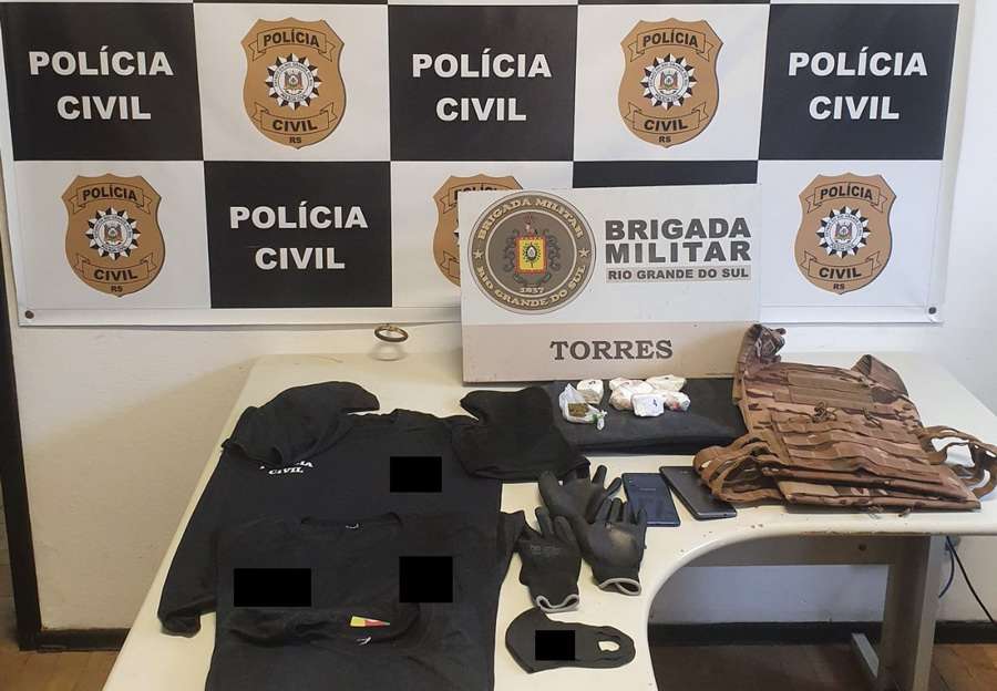 Junto com os dois homens, a polícia encontrou um colete balístico, uma capa camuflada para esse equipamento, três camisetas e máscaras, todos identificados com nomenclatura da Polícia Civil gaúcha, duas toucas do tipo “ninja”, seis porções de cocaína, uma porção de maconha e dois celulares.