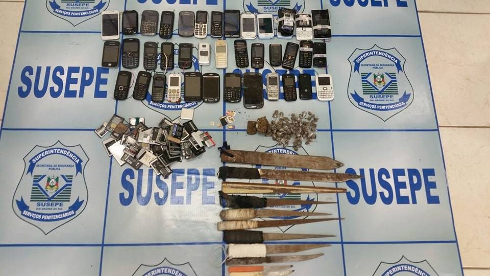 Foram encontrados 39 aparelhos celulares, dez facas artesanais, baterias de celular, diversas buchas de maconha e pedras de crack.