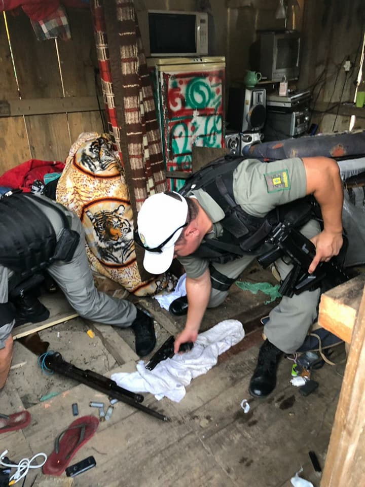 Duas pessoas que estavam no local conseguiram fugir correndo em direção a um matagal. O armamento estava enrolado em uma toalha, escondido embaixo do assoalho de uma das casas.
