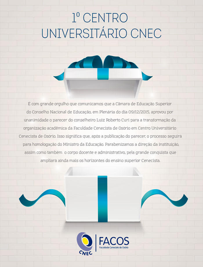 Em sessão Plenária, na data de ontem (10/12), a Câmara de Educação Superior aprovou por unanimidade a transformação da Faculdade Cenecista de Osório em Centro Universitário.