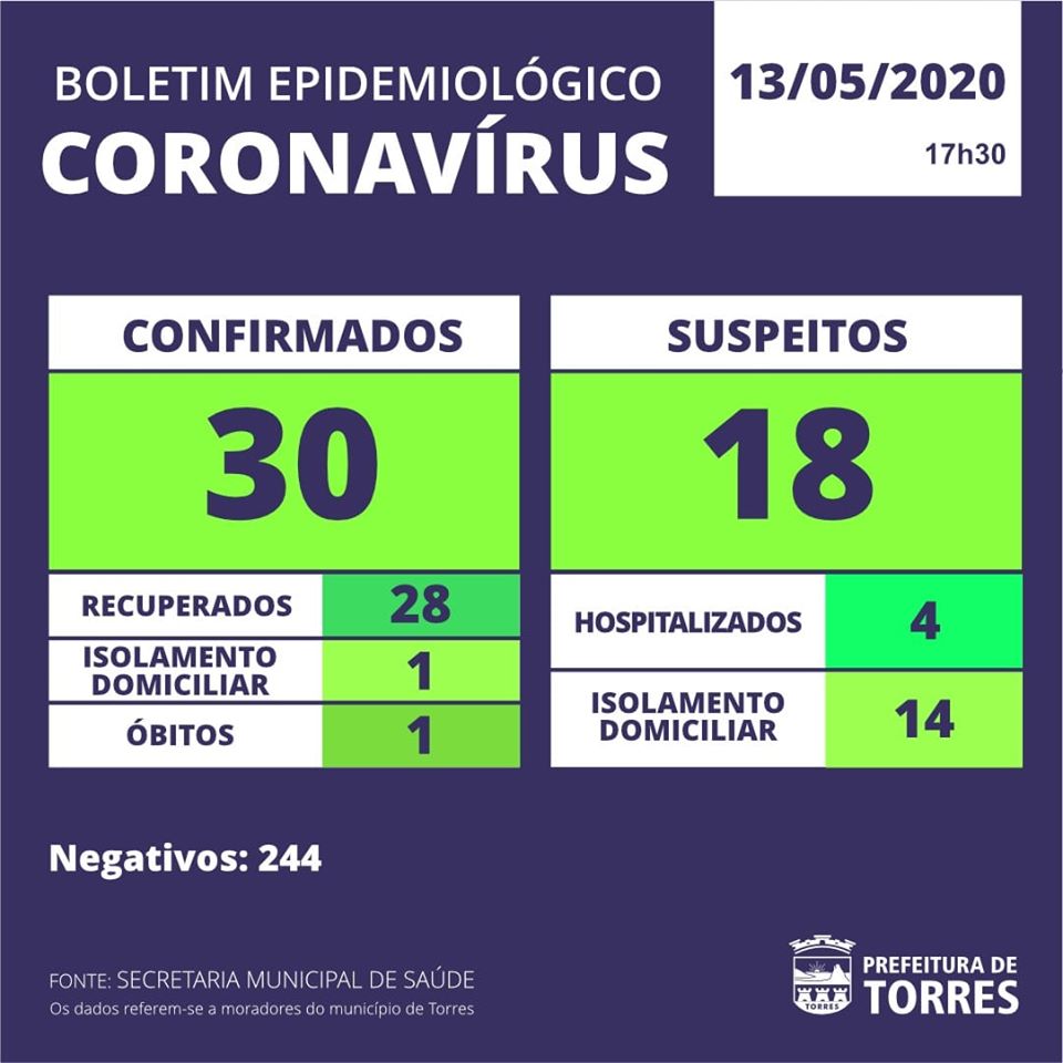 No mais recente Boletim Epidemiológico divulgado pela Secretaria Municipal de Saúde às 17h30min desta quarta-feira, 13 de maio, sobre a COVID-19 em Torres, estão registrados 30 casos confirmados (um a mais em relação ontem.), com 28 recuperados, um paciente em isolamento domiciliar e um óbito.