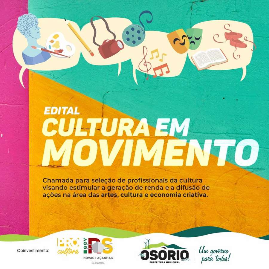 A prefeitura de Osório lança hoje, 18, o edital para seleção de profissionais da cultura, visando estimular a geração de renda e a difusão de ações nas áreas das artes, cultura e economia criativa e que tiveram suas rendas afetadas pelas medidas restritivas de combate ao Covid-19.