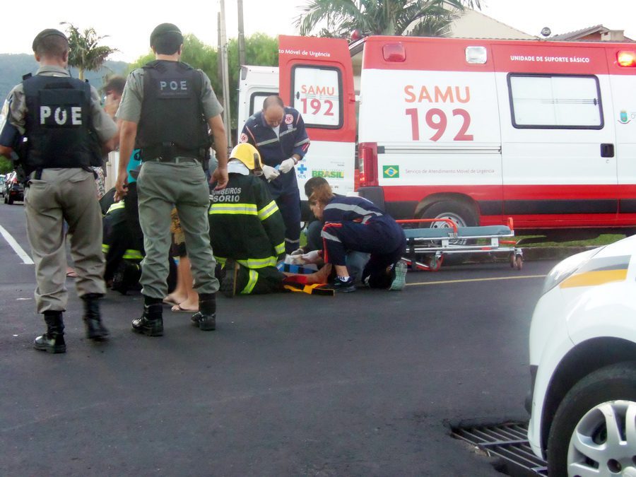 Um motociclista ficou ferido após colisão entre sua moto e um veículo, na esquina das ruas Garibaldi e Barão do Rio Branco, no bairro Glória.