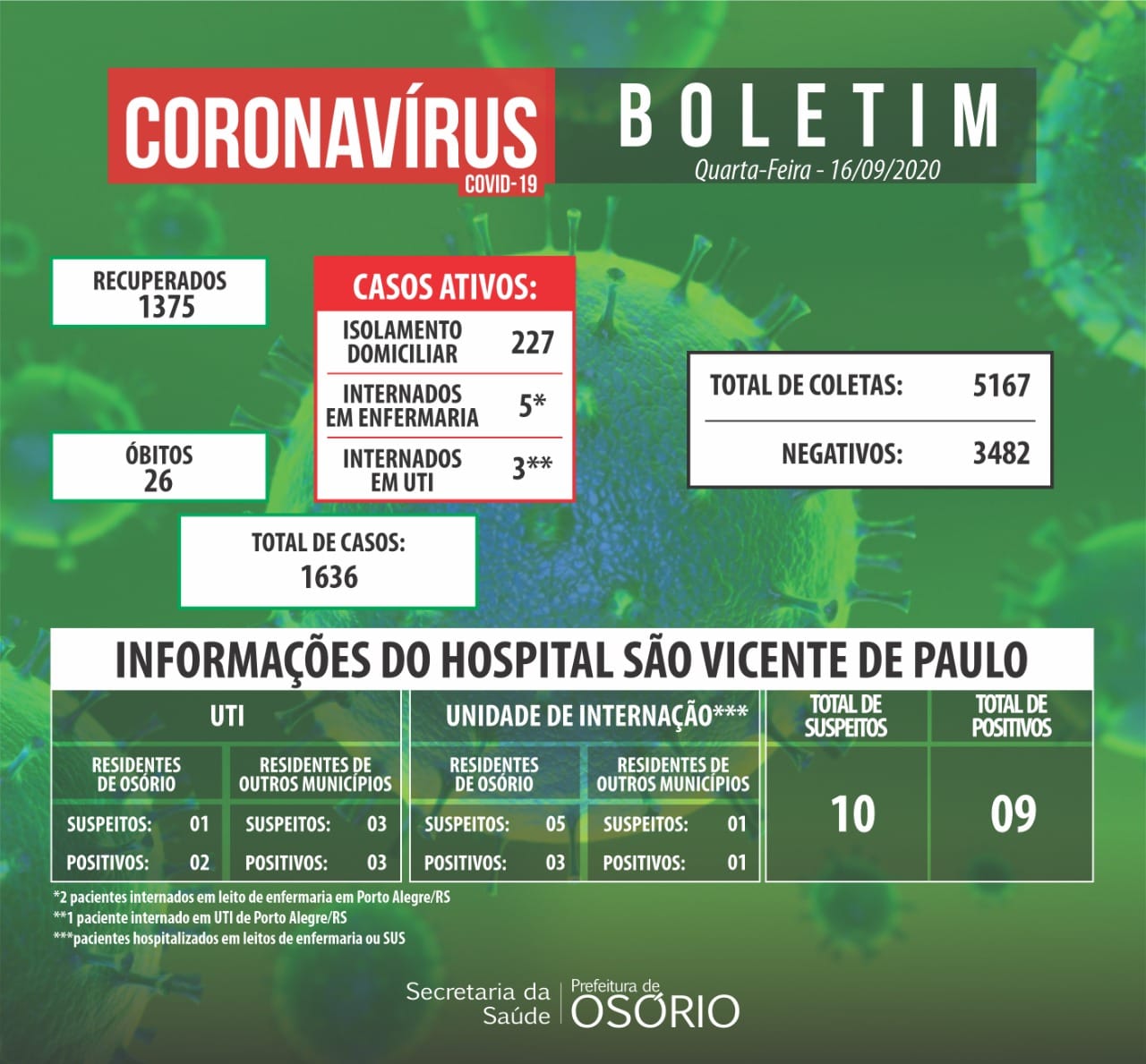 A Secretaria Municipal da Saúde de Osório registrou nesta quarta-feira (16/9) a 26ª morte de pessoa infectada pelo novo coronavírus..