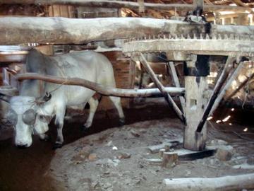 Esta engrenagem é movida a boi cangado, em tipo de almajarra, ou simplesmente uma canga, um pau alongado, inserido no mastro ou pião sobre o qual há uma roda dentada, ligada a uma polia com correia de lona. Os bois usam “atrolhos”, ficam com os olhos tampados parcialmente, para não ficarem tontos, pois andam sempre em círculo.