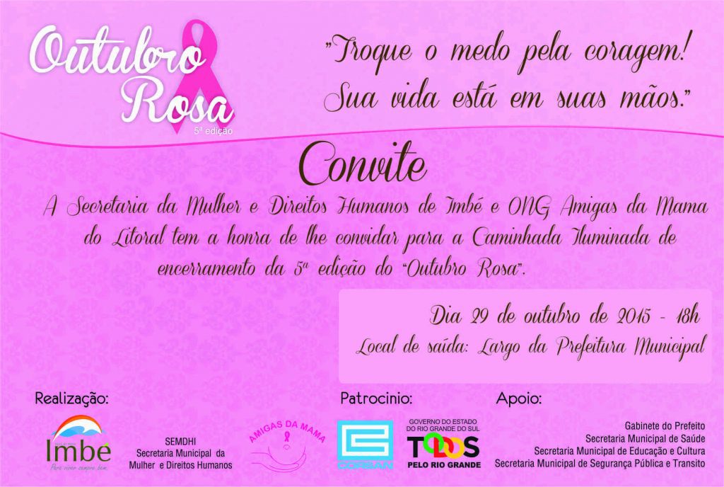 A Caminhada Iluminada terá sua saída às 18h e o grupo se reunirá em frente à Prefeitura seguindo pela Avenida Osório e indo em direção a Ponte Giuseppe Garibaldi. O evento faz parte da programação do movimento, que é uma realização da Secretaria Municipal da Mulher e Direitos Humanos (SEMDHI) e da ONG Amigas da Mama do Litoral, com apoio do Gabinete do Prefeito, CORSAN, secretarias municipais da Saúde, Segurança Pública e Trânsito, Obras e Viação.