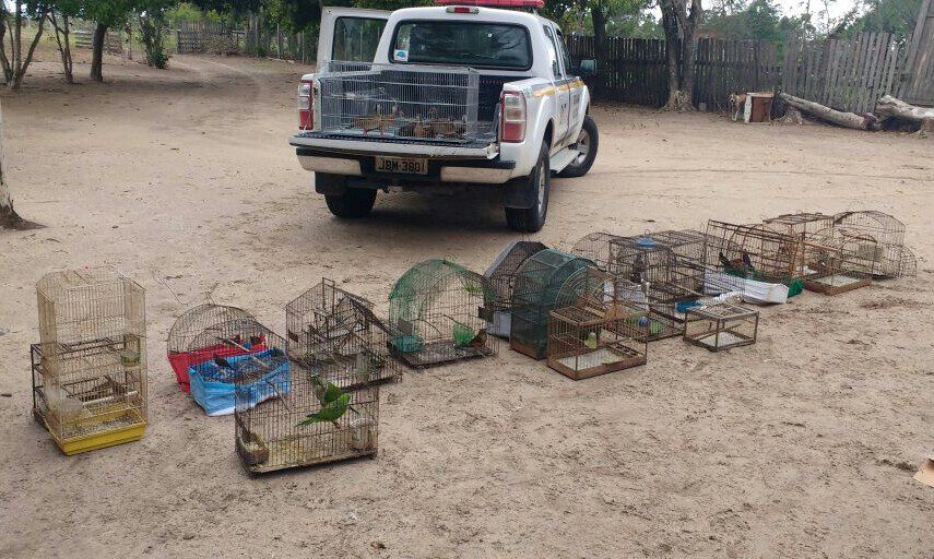 Foram apreendidos: 02 Tico-Tico, 02 Cravinas, 02 Caturritas, 02 Coleiro, 01 Sabiá Laranjeira, 03 Cardeais, 04 Canários da Terra, 02 Sabiá Papo Branco, 01 Sargento, 01 Tiê, 02 Trinca Ferro, 01 Sabiá da Praia, 08 filhotes de marrecas do pé vermelho e 21 gaiolas.