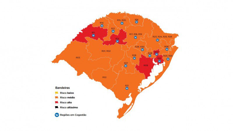 Com isso, a maior parte do território gaúcho ficou em cor laranja – são 17 regiões classificadas com risco médio. Nenhuma aparece em risco baixo (bandeira amarela) – a última vez foi na oitava rodada, em 26 de junho, ou altíssimo (preta) – não registrado até hoje.
