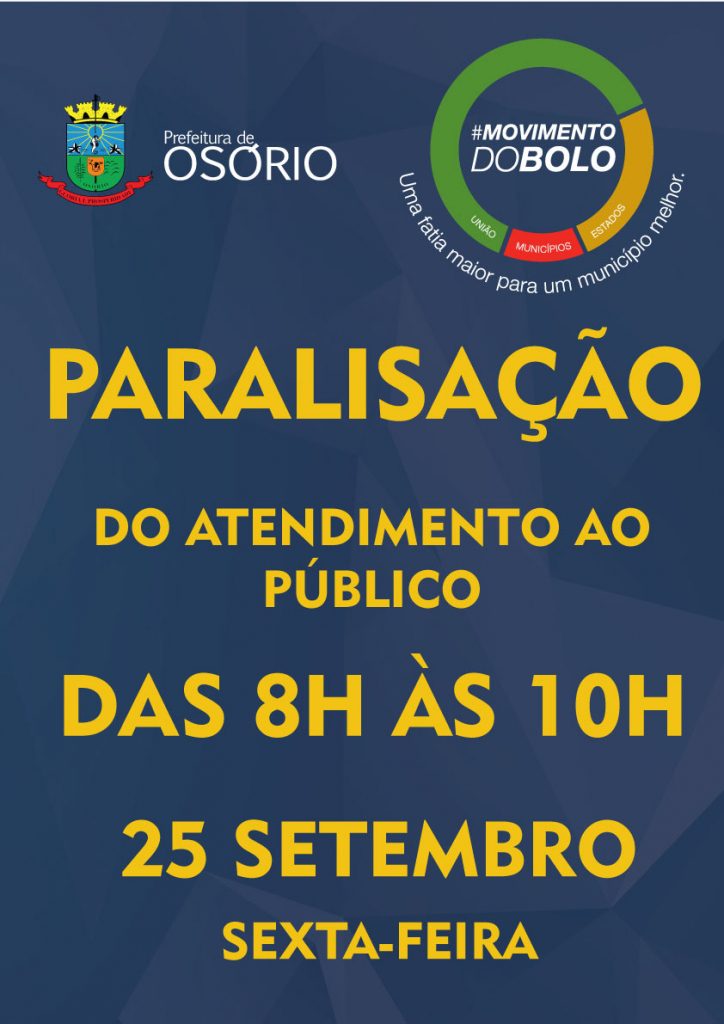 Por causa disto, a Prefeitura de Osório vai parar nesta sexta-feira, no horário das 8 h as 10 h. A decisão faz parte da proposta da Associação das Prefeituras do Litoral Norte, em protesto contra a União para divisão do bolo tributário para os municípios. Segundo a associação hoje de cada R$ 100 produzidos em nossas cidades, apenas R$ 18 ficam aqui. A maior parte vai para a União e para os Estados.