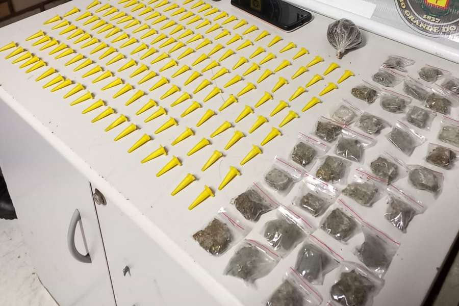 Ele foi abordado e constatado que no interior da sacola haviam 157 pinos de cocaína, pesando aproximadamente 100g, 37 porções de maconha, pesando aproximadamente 158g e dois celulares.
