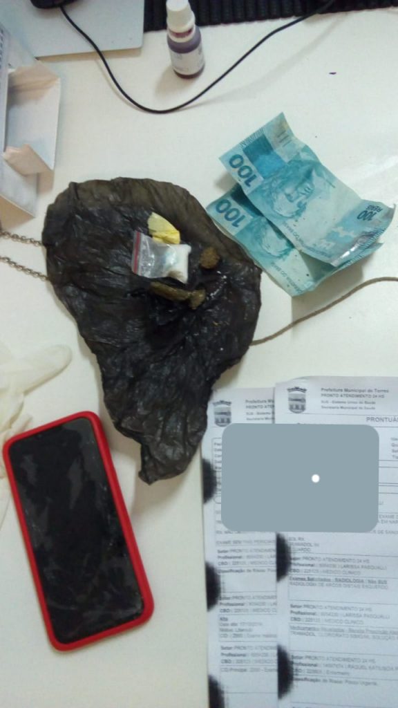 Na ação oram apreendidos: 5,1 gramas cocaína, 5,8 gramas de maconha e R$ 200.