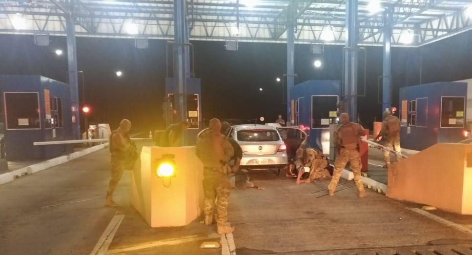 Ao ser detido no momento em que o veículo parou na cabine de cobrança do pedágio, o criminoso portava uma pistola calibre 9 milímetros com munição.