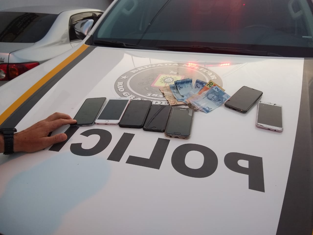 Eles já haviam roubado cinco cinco Smartphones (1 iphone XR, 1 Iphone 7, 1 Iphone 6s Plus, 1 Samsung A70, 1 Samsung S7) e estavam com R$ 163,00 reais, um relógio Xiaomi Mi Band e 0,85g de maconha.