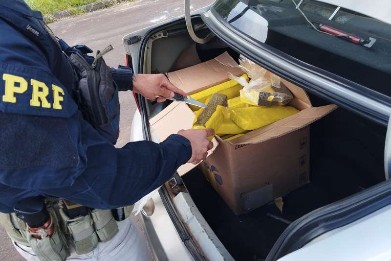 Os policiais encontraram os 28 kg da substância ilícita acondicionados em tabletes dentro de uma caixa de papelão no porta-malas do veículo.