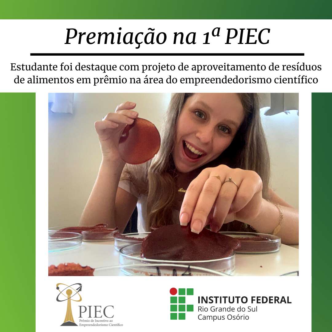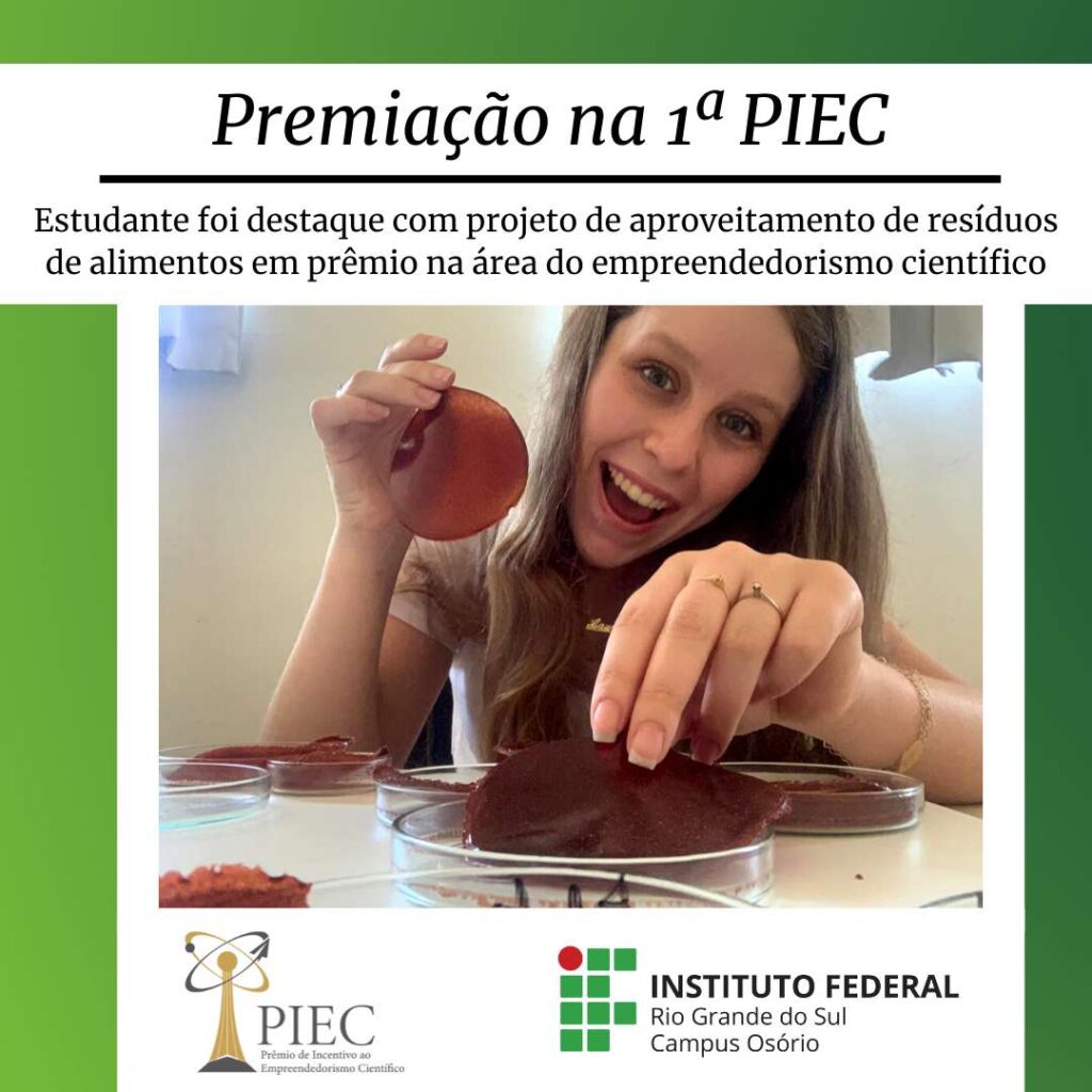 A pesquisa ‘BioStretch: Desenvolvimento de plástico biodegradável utilizando resíduos industriais’, desenvolvida pela estudante Laura Nedel Drebes, foi vencedora na categoria ‘Consciência Circular’ do 1º Prêmio de Incentivo ao Empreendedorismo Científico (PIEC). Os vencedores foram divulgados na tarde de terça-feira, 15 de junho de 2021, pela página do Instagram piec.br .