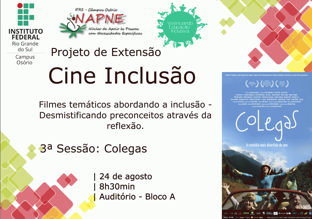 Na manhã de 24 de agosto de 2016, às 8h30, o auditório do Campus Osório do Instituto Federal do Rio Grande do Sul vai virar cinema mais uma vez! É que será exibido pelo projeto Cine Inclusãoo longa-metragem “Colegas” – primeiro filme brasileiro protagonizado por atores com Síndrome de Down (Ariel Goldenberg, Rita Pokk e Breno Viola). Dirigido e roteirizado por Marcelo Galvão, a comédia narra as aventuras de jovens apaixonados por cinema que, inspirados pelo filme “Thelma & Louise”, resolvem fugir em busca de seus sonhos.