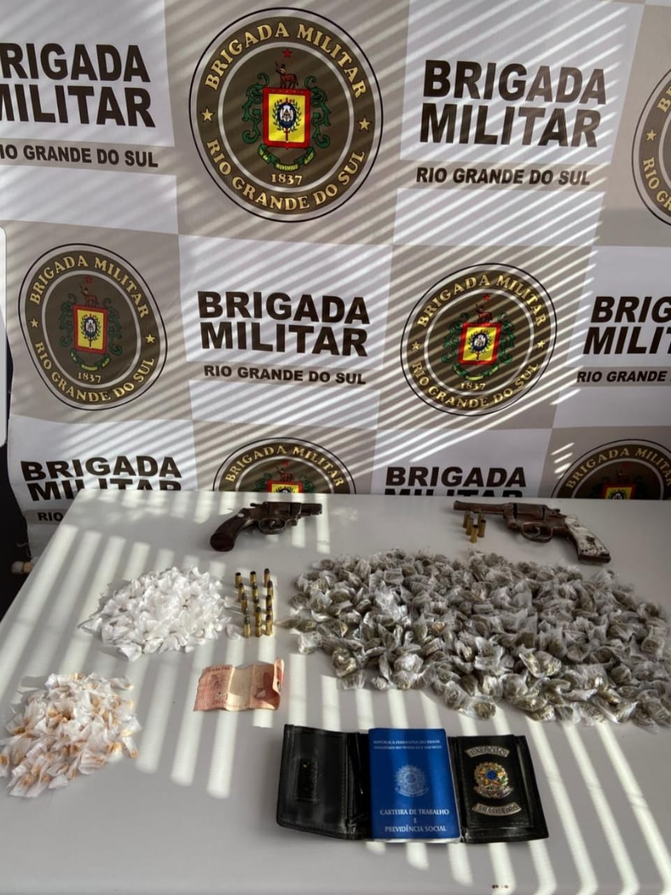 Foram apreendidos um veículo VW/GOL, de cor cinza, um revólver marca TAURUS calibre .32 municiado com 6 munições, sendo que dois deflagrados e com numeração suprimida, um revólver marca STANLEY calibre .38, sem registro no sistema, municiado com duas munições deflagradas, 350 porções de maconha, 135 petecas de cocaína, 96 pedras de crack e nove munições de cal.38 intactas.