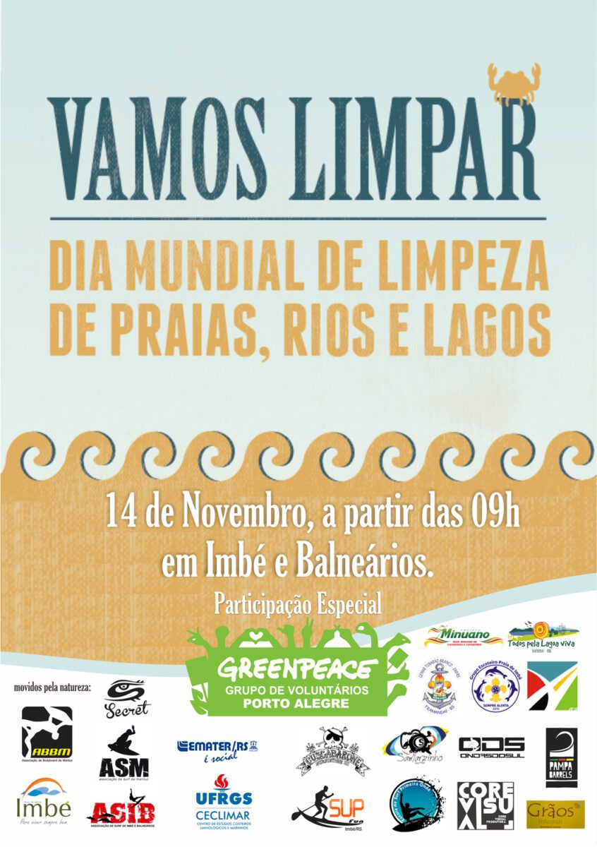 No próximo sábado (14), haverá uma grande ação de limpeza na beira mar de Imbé. Diversas entidades e empresas estão envolvidas com o evento, que atuará em quase toda orla do município. A mobilização é voluntaria e tem o objetivo de conscientizar as pessoas para o problema do lixo (resíduo) nas praias, rios e lagos do Brasil. Originalmente a iniciativa ocorreria no dia 19 de setembro, considerado o “Dia Mundial de Limpeza de Rios, Praias e Lagos”, mas foi transferida devido às condições climáticas.