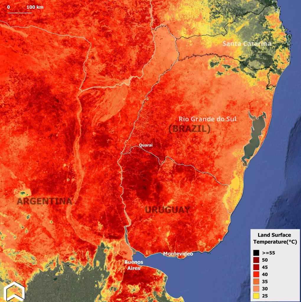A temperatura da superfície atingiu valores alarmantes no Rio Grande do Sul e em regiões vizinhas durante a última terça-feira, de acordo com imagens captadas pelo satélite europeu Sentinel-3.