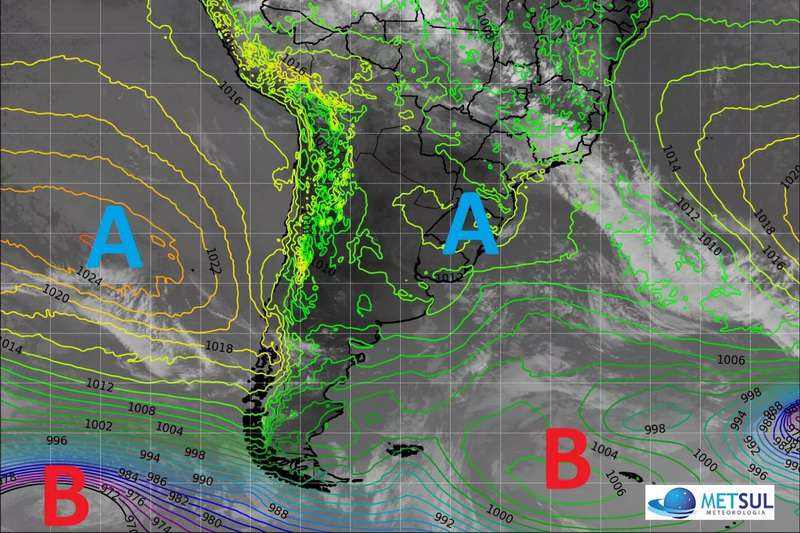 Observa-se também outro sistema de alta pressão na costa do Chile, no Oceano Pacífico, e um ciclone extratropical no extremo Sul do Atlântico, o qual origina uma frente fria que se estende até o Sudeste do Brasil, trazendo precipitações para algumas regiões.
