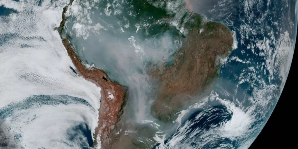Imagens de satélite da NASA indicam que uma vasta área do Brasil está coberta por fumaça, principalmente originada de queimadas na parte sul da região amazônica.