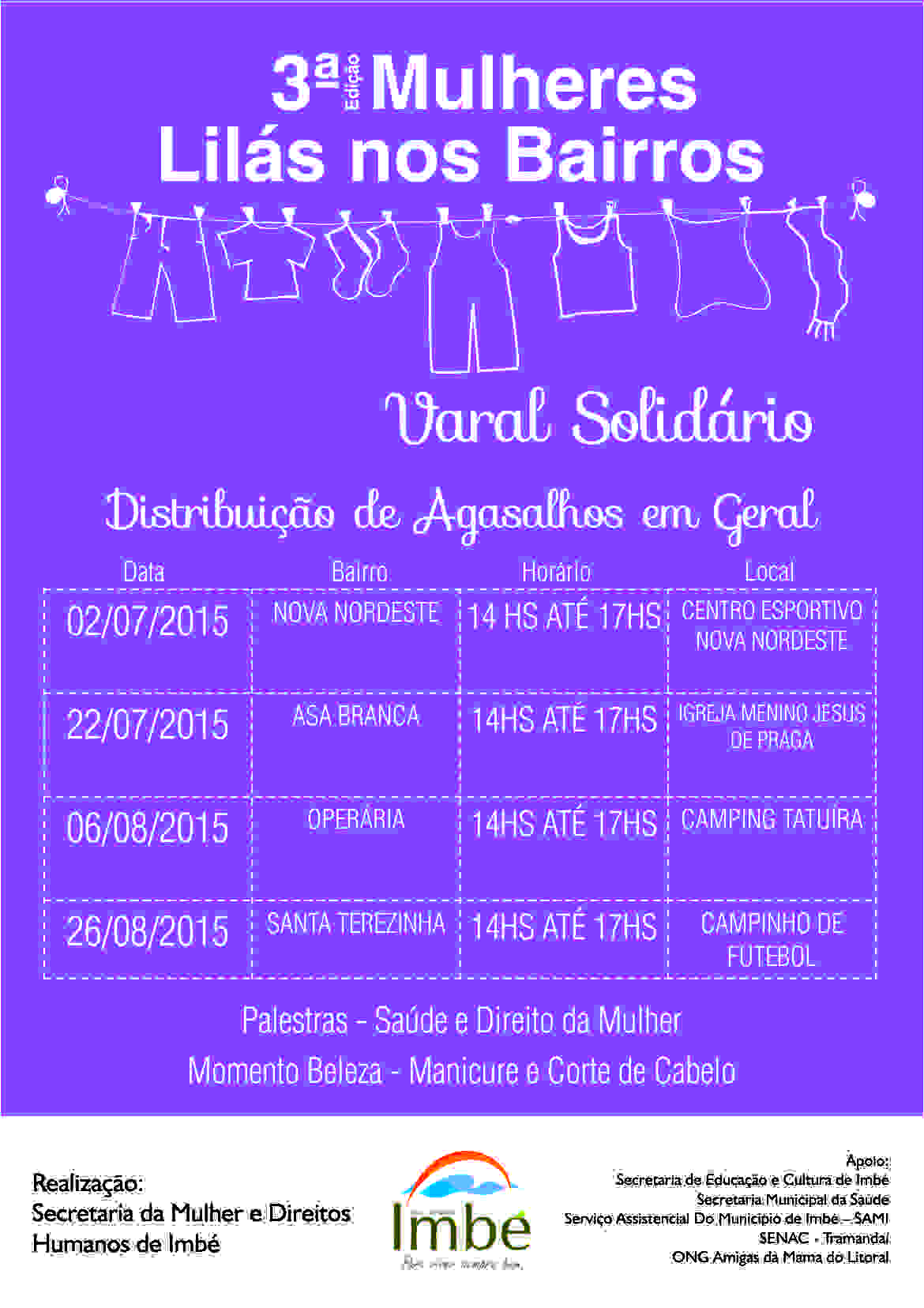 Diversas ações compõe o projeto, como o “Varal Solidário”, que distribui agasalhos em geral, corte de cabelo, palestras sobre a Lei Maria da Penha e também sobre a saúde da mulher. A primeira edição deste ano ocorrerá no Bairro Nova Nordeste.