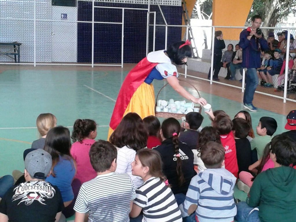As crianças ganham doces e brincam com personagens de histórias infantis, caracterizados pela secretária Joselaine Cardoso.