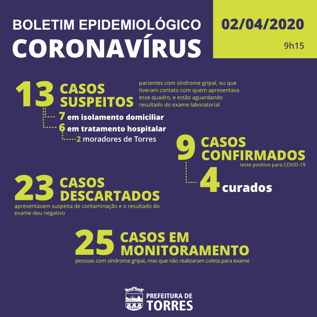 Novo Boletim Epidemiológico divulgado pela Secretaria Municipal de Saúde às 9h15min desta quinta-feira, 02 de abril, consta que em Torres existem nove casos confirmados de COVID-19.