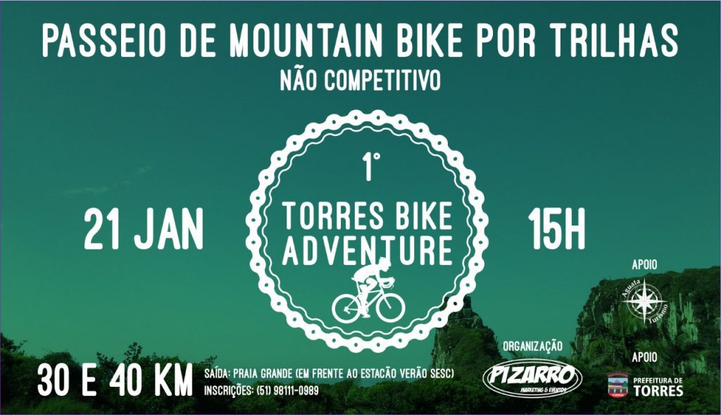 A aventura tomará conta de Torres no dia 21 de janeiro, sábado. A Pizzarro Eventos em parceria com a Prefeitura Municipal de Torres e a Aguatá Turismo promoverá o 1° Torres Bike Adventure.