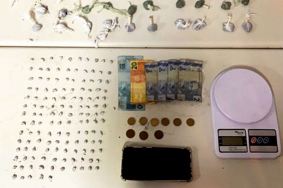 A dupla foi abordada, sendo localizados os entorpecentes apreendidos, um aparelho celular, uma balança de precisão e R$ 128.