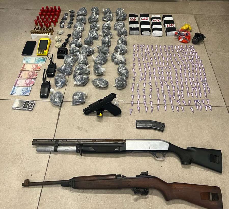 Ainda em diligências, foram apreendidas 5.460 pedras de crack, 62 porções de maconha, 224 porções de cocaína, uma espingarda calibre .12 com numeração raspada, 27 munições do mesmo calibre, um rifle calibre .30, 21 munições do mesmo calibre, 19 munições de calibre .762, um carregador de cabina calibre .30, cinco munições de calibre .9mm, dois radiocomunicadores, máquina de cartões de crédito, celular e balança de precisão.