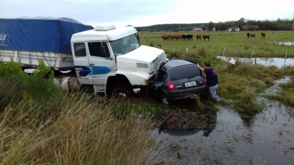 A colisão envolveu uma carreta e um Renault Clio.