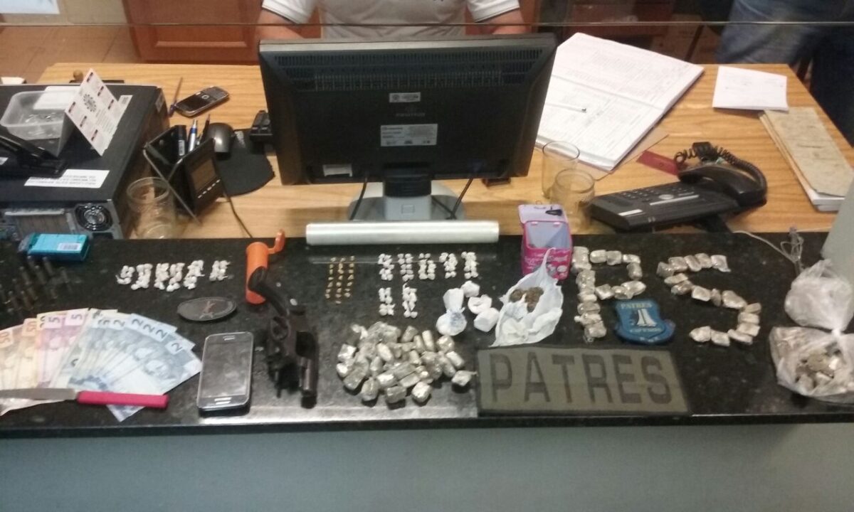 Os PMs realizavam patrulhamento na Rua Major João Marques, quando em uma abordagem de rotina flagrou o trio com um revólver calibre 32, nove munições de calibre 32, 121 tijolinhos de maconha, 148 pedras de crack, uma balança de precisão, material para embalar a droga e R$ 146,00.