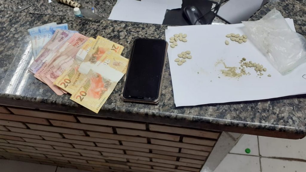 Com eles foram localizados 61 comprimidos de ecstasy, 01 Porção de maconha, 03 celulares e R$ 278,70.