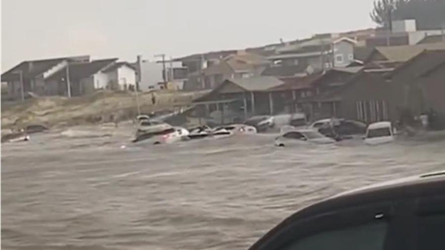 Imagens feitas por banhistas mostram as ondas chegando até os veículos estacionados, que começam a flutuar.